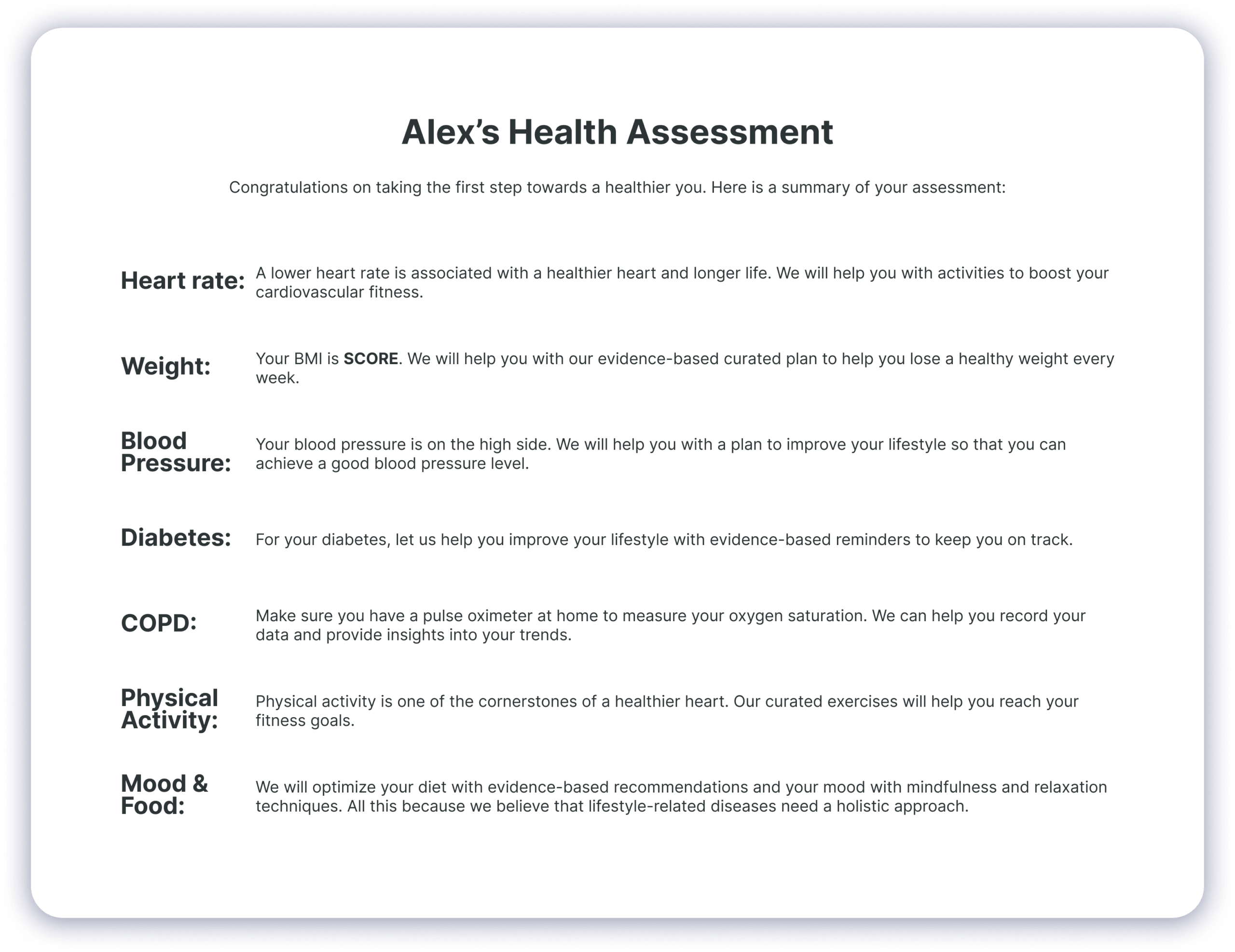 Your plan integrates key health metrics—heart rate, blood pressure, glucose levels—to holistically enhance your well-being.