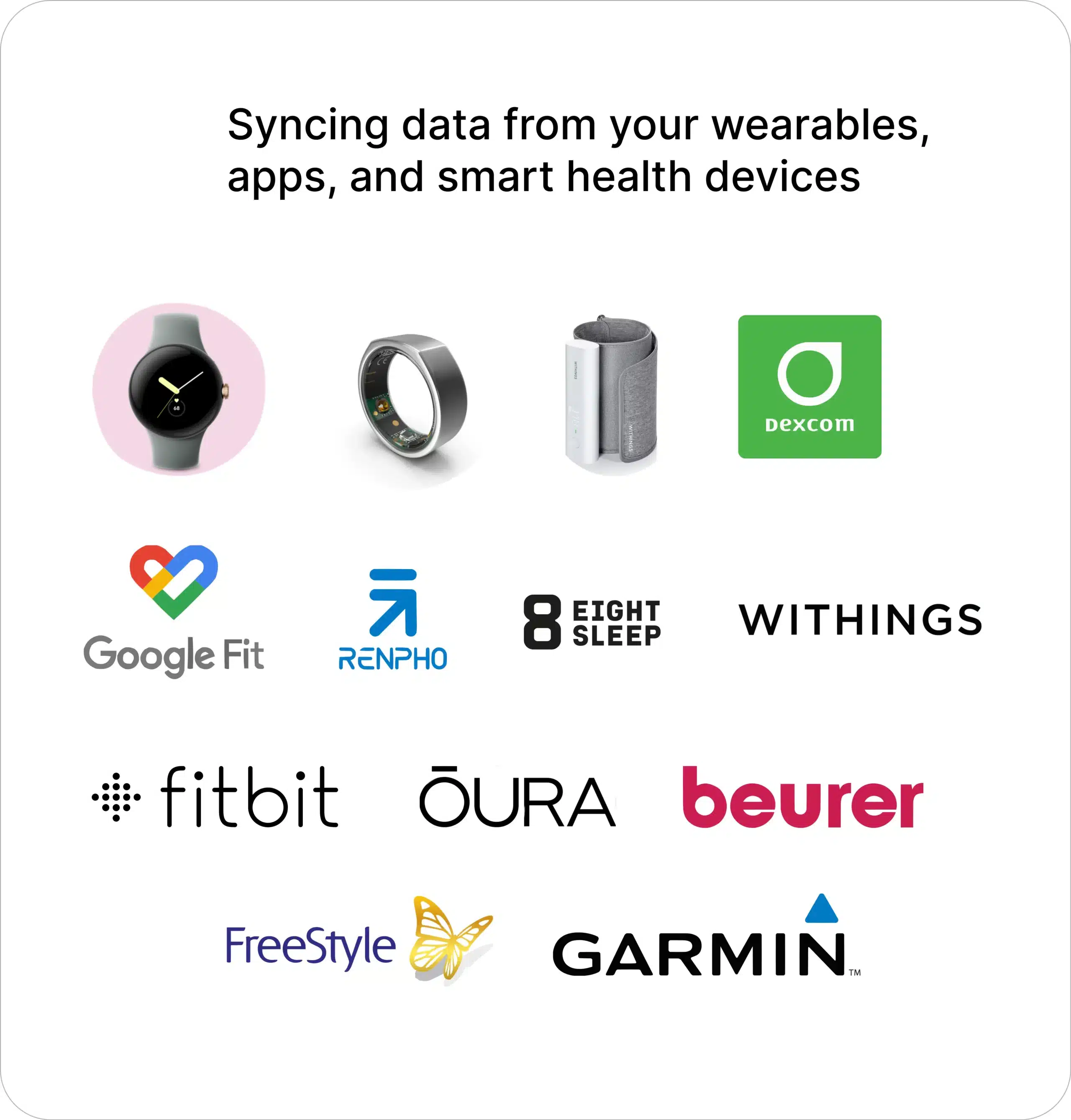 Aoide Health offers versatile integration options with a wide range of apps and devices, ensuring you can conveniently connect your health data for a seamless experience. We connect with an extensive array of partners, including Beurer, Dexcom (G6 and older models), 8Sleep, Freestyle, Fitbit, Garmin, Google Fit, Hammerhead, iHealth, MyFitnessPal, Oura, Peloton, Renpho, Strava, Wahoo, Whoop, Withings, Zwift, Polar, and Cronometer.